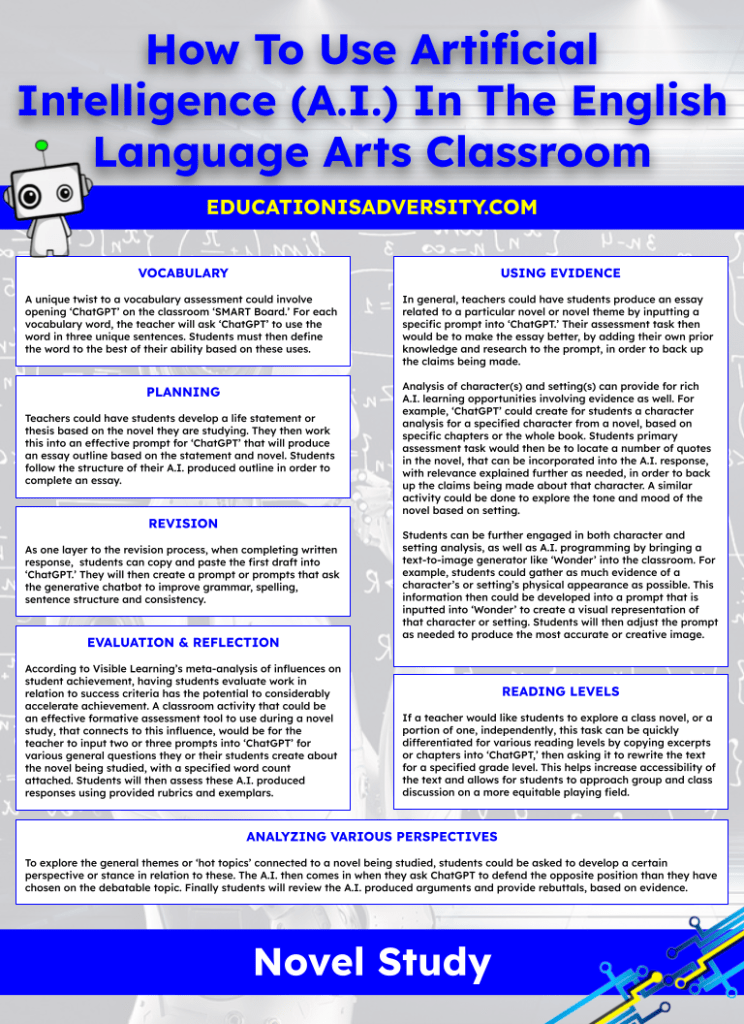 How To Use Artificial Intelligence (A.I.) In The English Language Arts Classroom: Novel Study Posted by chrisbgardner on November 6, 2023November 6, 2023 Share this: Share on Facebook (Opens in new window) Facebook Share on X (Opens in new window) X Share on LinkedIn (Opens in new window) LinkedIn Share on Pinterest (Opens in new window) Pinterest Email a link to a friend (Opens in new window) Email Print (Opens in new window) Print More Share on Tumblr (Opens in new window) Tumblr Share on Reddit (Opens in new window) Reddit Share on Pocket (Opens in new window) Pocket Share on Telegram (Opens in new window) Telegram Share on WhatsApp (Opens in new window) WhatsApp Like Loading... Related